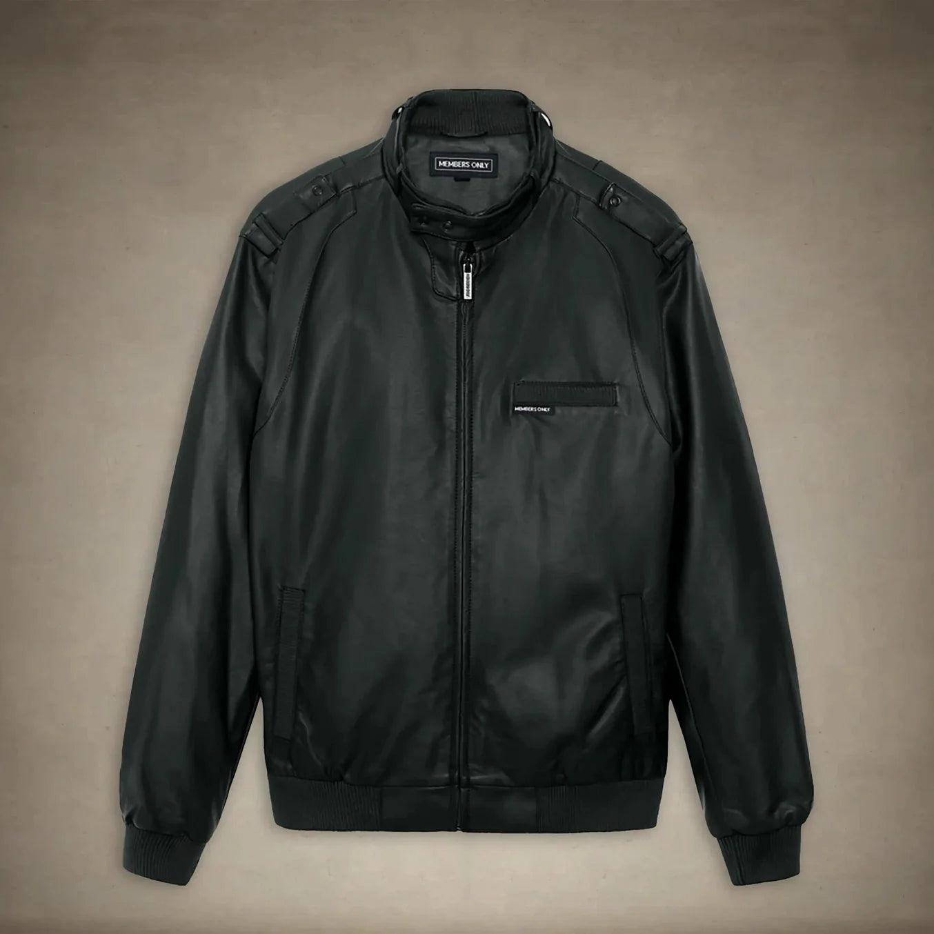 Members Only Classic Faux Leather Iconic Jacket. Soft Fabric shell, Diamond Quilt Inside with Lightweight Poly Fill for added Warmth. Iconic throat latch and shoulder epaulettes, and zip front.